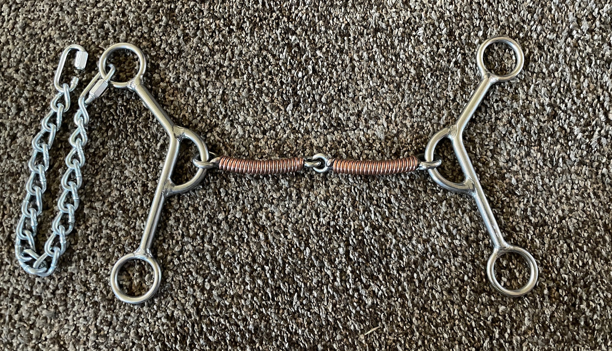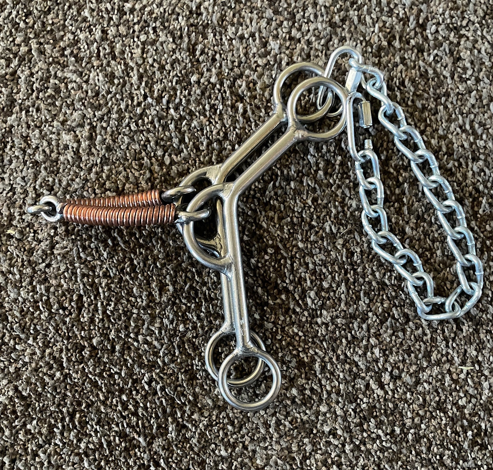 William Crutcher reverse gag snaffle bit with angled 7 inch shank and 5-1/2 inch copper wrapped mouth.