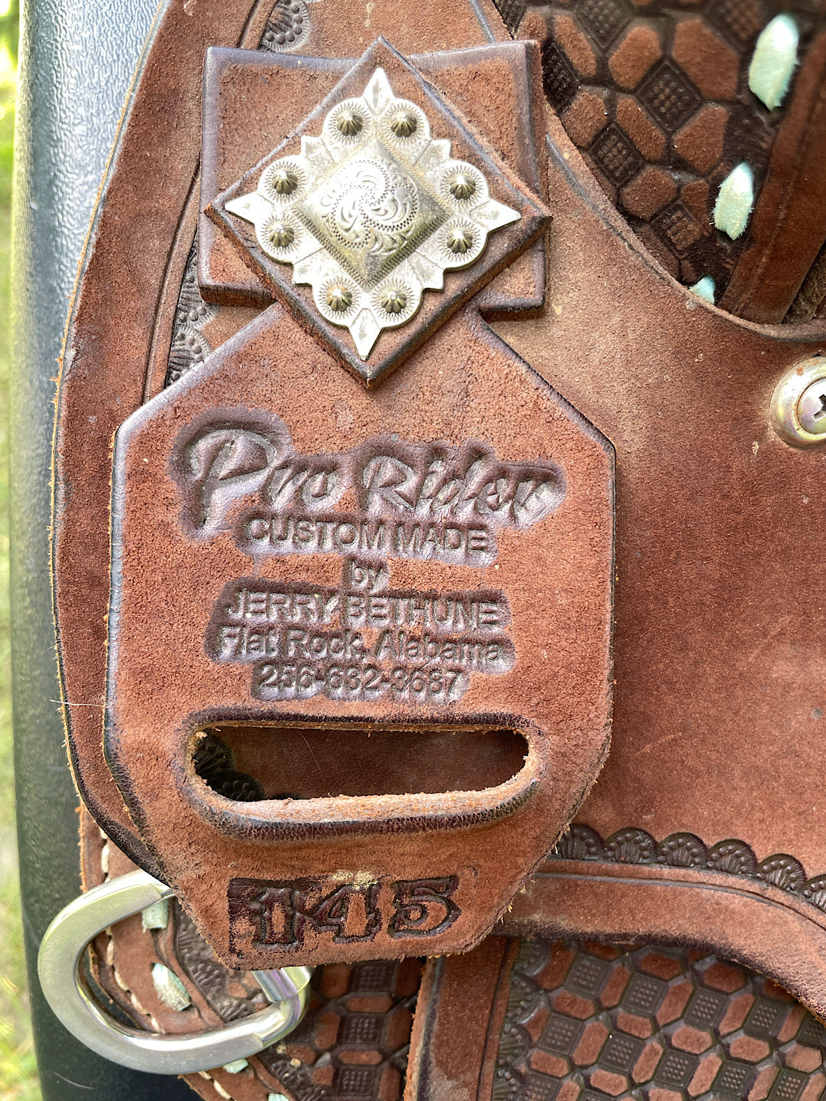- Border tooled and buck stitched accent on jockeys and fenders.