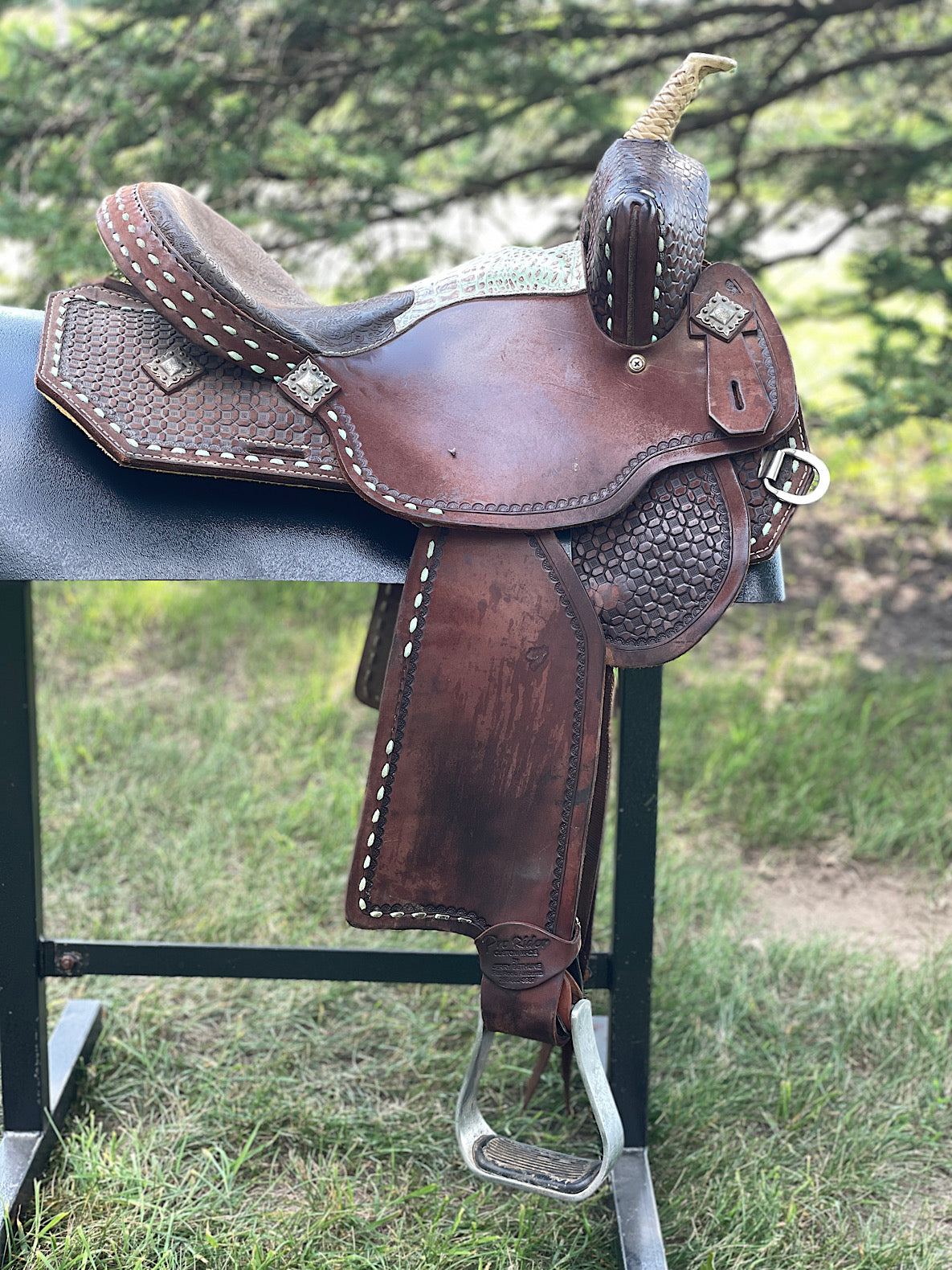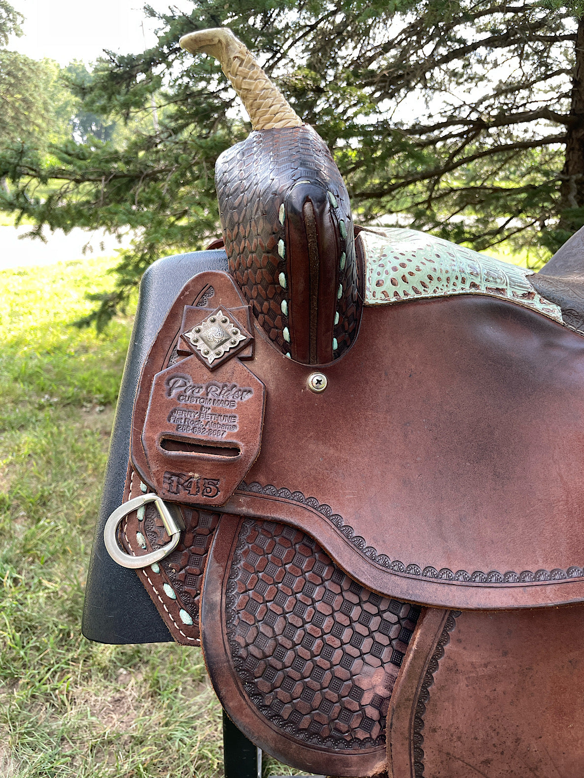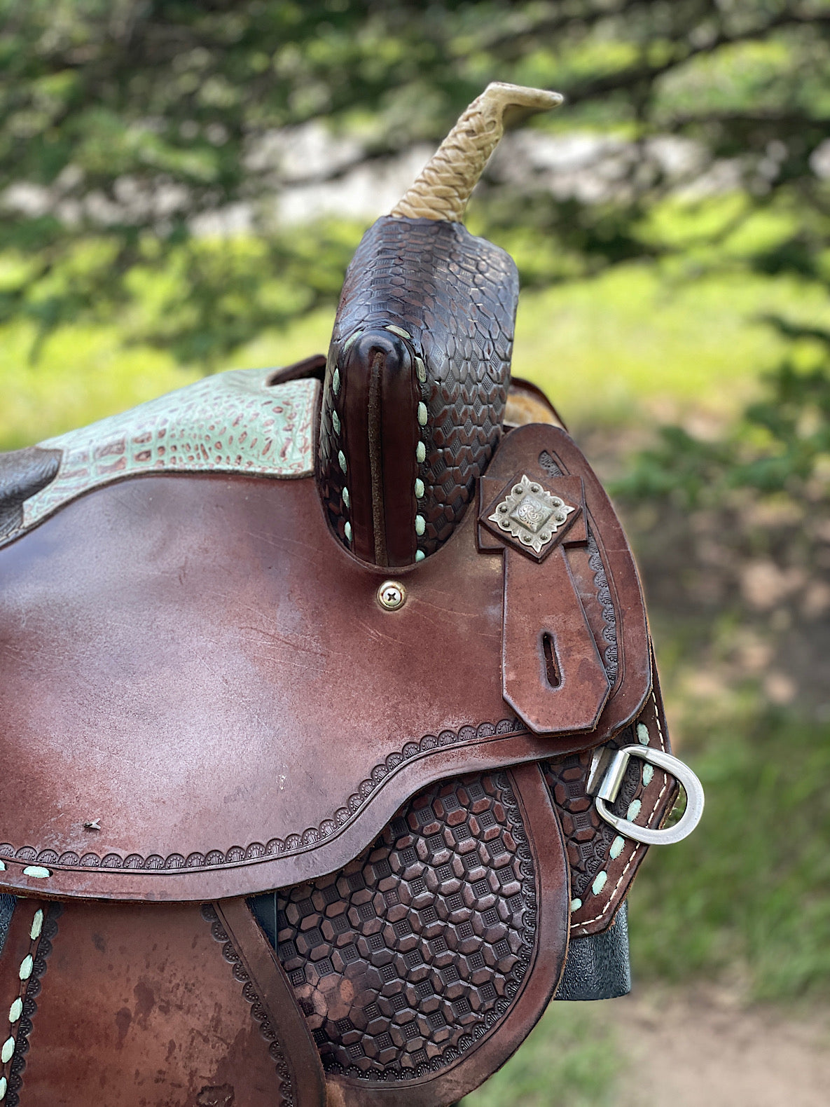 Used 14.5 inch Pro Rider saddle with faux gator & daisy suede seat with buck stitching accents!